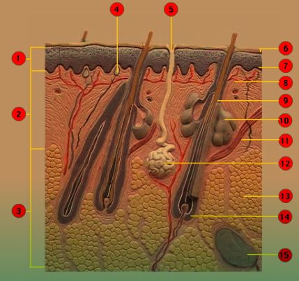 1. Opperhuid 2. Lederhuid het corium of de dermis, waarvan 10% uit squalene (C30 H50) bestaat. 3. het onderhuidsbindweefsel: de zogenaamde subcutis 4. tastlichaampjes 5. Porien. 6. Hoornlaag 7. Kiemlaag 8. Bloedvaten. 9. Haar. 10. Talgkliertjes. 11. Haarspiertjes. 12. Zweetkliertjes. 13. Vetlaag. 14. Haarpapil. 15. Druklichaampjes.